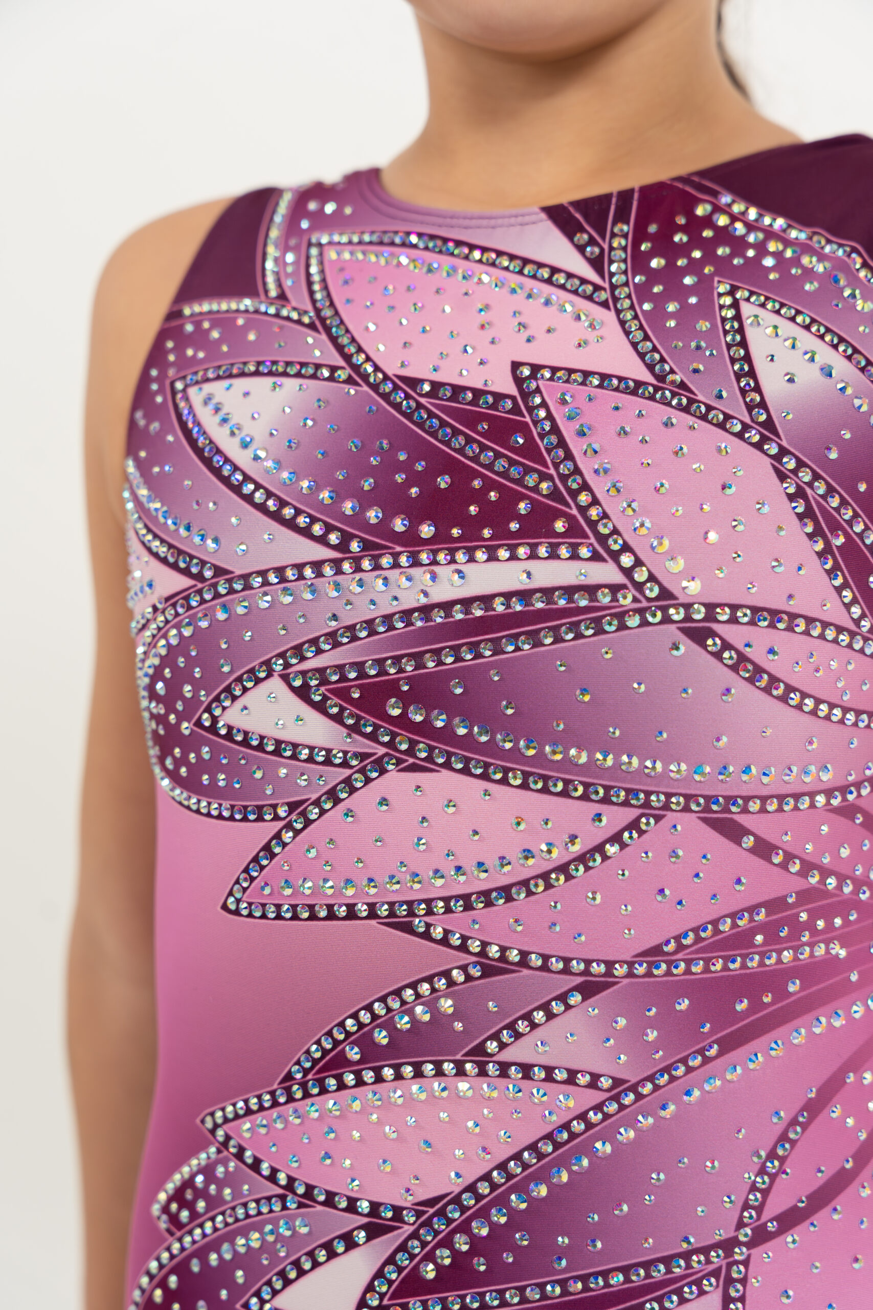This stunning design features a gradient blend of pink and plum tones, highlighted by a bold petal-inspired pattern that radiates across the front and back. Subtle rhinestone accents add just the right touch of sparkle, catching the light with every movement. The classic scoop back design completes the look with timeless elegance and style.
